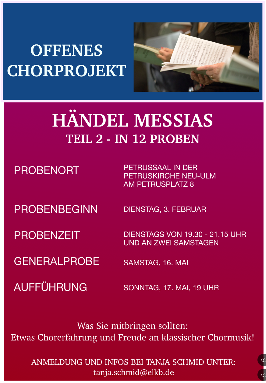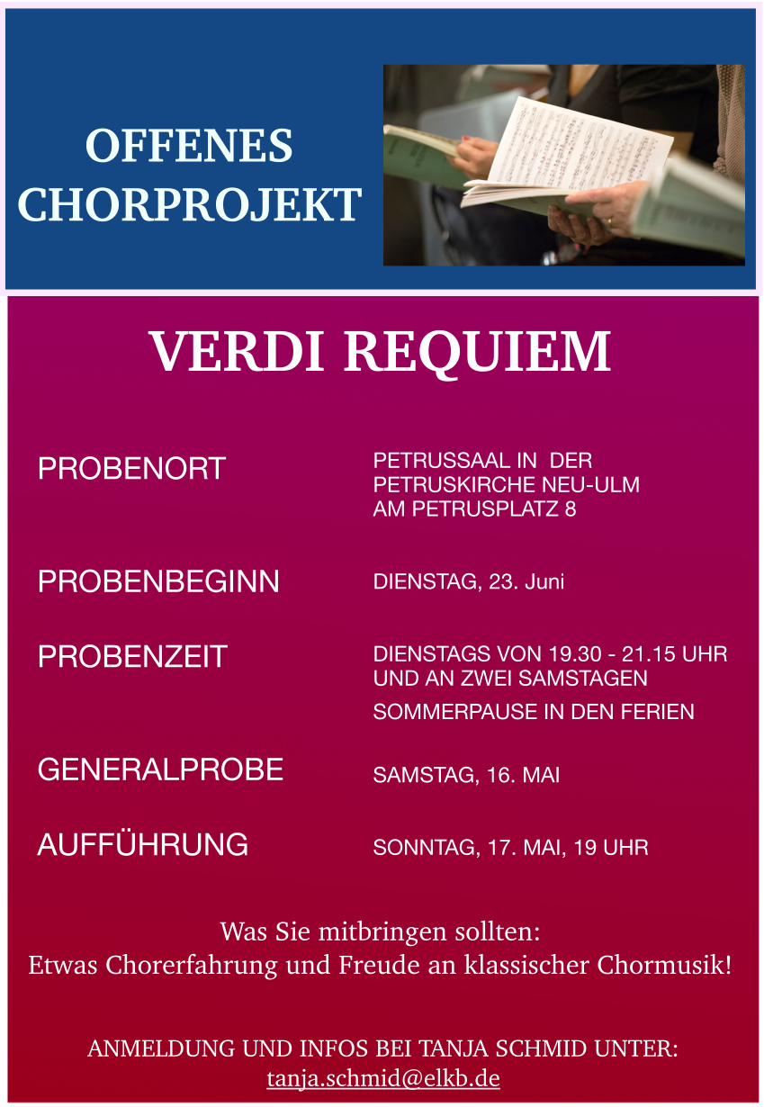 Wir proben zukünftig projektbezogen. Unsere Proben sind in der Regel dienstags 19:30 – 21:15 im Petrussaal unter der Petruskirche Neu-Ulm.